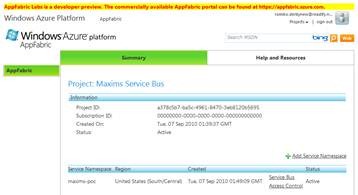To get started with AppFabric, there is a free CTP portal where you can register a service, below is a Service Bus, hosted on the CTP labs cloud, which is free of charge.