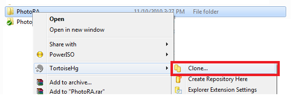 So i created a new folder called PhotoRA, which will be my clone. I right click the folder and select Clone: