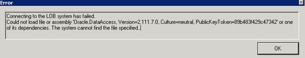 <!– Add in Machine.Config –> <assemblyBinding xmlns="urn:schemas-microsoft-com:asm.v1"> <dependentAssembly> <assemblyIdentity name="Oracle.DataAccess" publicKeyToken="89b483f429c47342" culture="neutral" /> <bindingRedirect oldVersion="2.111.7.0" newVersion="2.112.1.2"/> </dependentAssembly> </assemblyBinding> |