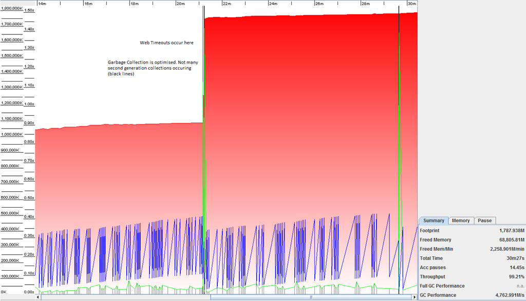 Another load run below, shows similar results but faster GC performance after the following changes to the system: