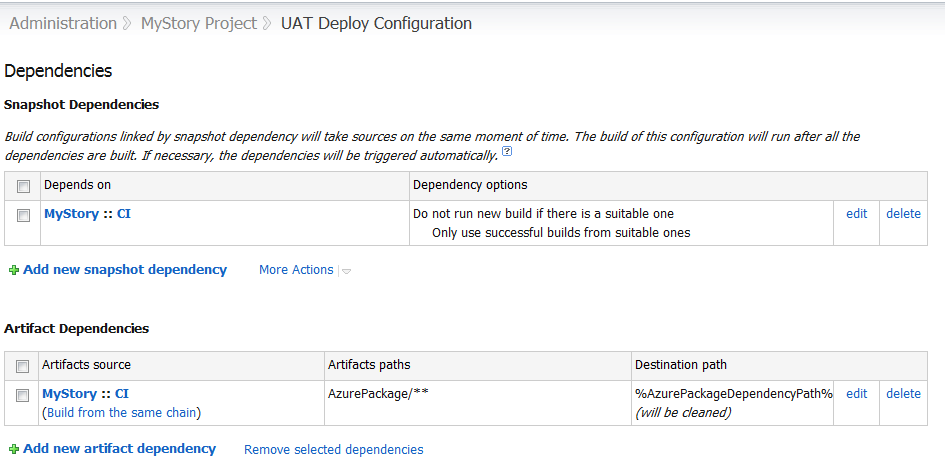 Ok, now we need to tell our Azure Deployment project to have a dependency on the CI project we configured above.